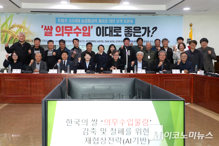 전종덕 의원(진보당, 비례)과 국민과함께하는 농민의길, 진보당 농민당, 전국먹거리연대, 더불어민주당 이원택·문금주 의원이 15일 국회 의원회관 8간담회의실에서 트럼프 2.0시대 농업통상의 새로운 대안 모색 토론회 ‘쌀 의무수입 이대로 좋은가?’ 토론회를 열었다.