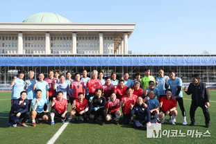 국회의원축구연맹과 국회출입기자단축구팀이 2일 국회 축구장에서 친선 연습경기를 가졌다. 국회의원축구연맹은 오는 25일 서울 마포구 상암월드컵 경기장에서 여야 의원들이 한 팀이 돼 일본과 승부를 벌일 예정이다. 이에 앞서 국회출입기자단축구팀과 연습 경기를 펼친 것이다. 이날 연습경기에는 더불어민주당에는 김영진·김용갑·천준호·김영배·김기표·김원이·이재강·문금주·김동아 의원 등이 국민의힘에서는 이상휘·이헌승·정동만·박형수·박성민·구자근·김승수·의원 등이 출전해 컨디션을 점검했다. 한편, 이날 연습경기에는 더불어민주당 한병도 원내대표와 서삼석·임오경 의원 등도 응원을 나와 눈길을 끌었다. 또, 한상철 국회의원축구연맹 감독과 국회출입기자단축구팀 단장인 구영회 기자와 감독인 이용우 기자는 연습경기지만 필승을 다졌다.
