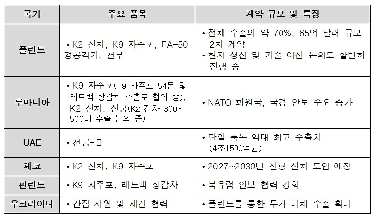 또 중동지역에서는 아랍에미리트(UAE)와 지난해 4조1500억원 규모 계약으로 단일 방산 품목 역대 최고 수출치를 기록했고, 사우디아라비아와는 독자 개발 대형 방산무기 ‘천궁-Ⅱ’ 계약도 체결했다. 동유럽에는 폴란드, 체코, 슬로바키아, 루마니아 등에 K2 전차, K9 자주포, FA-50 전투기, 천무 다연장로켓 등을 수출 중이다. 특히 폴란드와 루마니아가 주요 수출국이다.