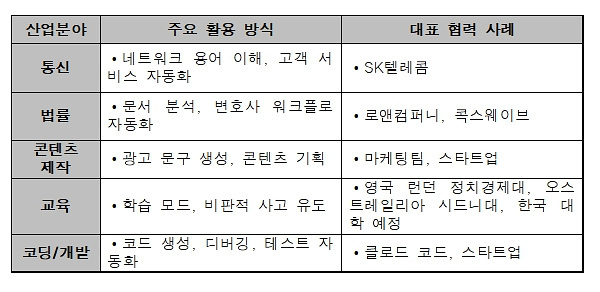 이러한 특징으로 마케팅팀에서는 광고 문구 자동 생성, 성과 개선 시스템 구축 등으로, 또 법무팀에서는 전화 트리 시스템 프로토타입 제작 등 비개발 업무의 자동화 등 회사의 기본적인 업무의 효율성을 높일 수 있다.