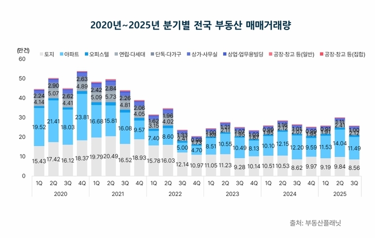 AI 기반 상업용 부동산 전문 프롭테크 기업 부동산플래닛은 국토교통부 실거래가 자료를 기반으로 분석한 2025년 3분기 전국 부동산 유형별 매매시장 동향 보고서를 13일 발표했다.