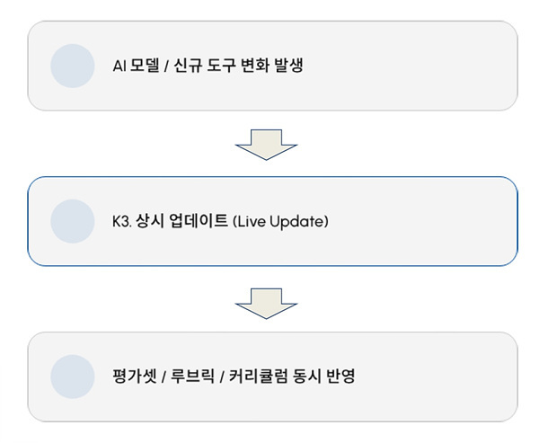 AI 활용에 기반해 운영적인 측면에서 혁신을 이루기 위해서는 ‘연간 개편’에서 ‘상시 업데이트’로 시스템을 바꿔야 한다. 모델·도구가 변화할 때마다, ‘평가 테스트셋, 루브릭, 커리큘럼’을 즉시 동기화해 ‘상시 업데이트’로 배포한다. 이는 개발자 커뮤니티에서의 ‘패치 노트’ 방식과 같다. 모델의 속도를 교육의 속도로 직결시키는 유일한 방법이기도 하다.