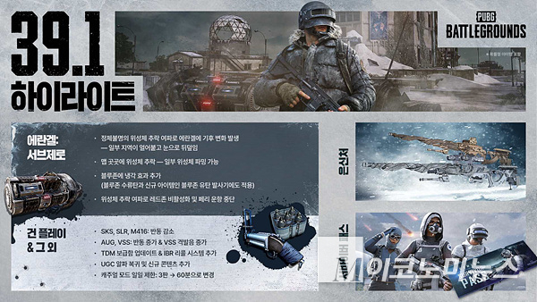 크래프톤(Krafton)은 ‘PUBG: 배틀그라운드’(PUBG: BATTLEGROUNDS, 이하 배틀그라운드)가 39.1 업데이트를 통해 혹한의 생존 환경으로 변한 ‘에란겔: 서브제로(Subzero)’를 선보인다. 이번 업데이트에서는 세계적인 럭셔리 패션 하우스 발렌시아가(Balenciaga)와의 협업 콘텐츠, UGC 알파 모드의 재오픈, 그리고 총기 밸런스 조정 등 다채로운 콘텐츠가 함께 적용된다.