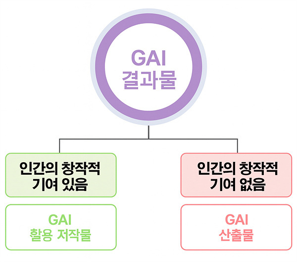 저작권법상 저작물은 ‘인간의 사상·감정을 표현한 창작물’이어야 하고, GAI가 만든 산출물은 저작물 성립 요건을 충족하지 못해 보호 대상이 아니다.