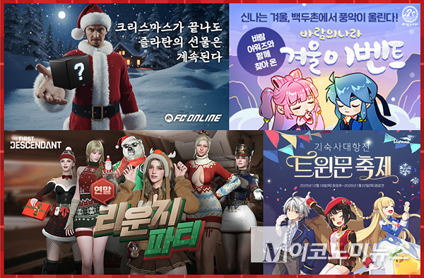‘바람의나라’에서는 24일부터 1월 21일까지 백두대란 겨울 이벤트의 일환으로 1, 2주차에 ‘백두눈싸움’, 3, 4주차에는 ‘산타의 선물사수’를 선보인다. ‘아스가르드’는 1월 15일까지 ‘크리스마스 퍼즐 모으기’ 이벤트를 진행한다. 다양한 인게임 활동을 통해 크리스마스 퍼즐을 모으면, 수집 단계에 따라 이벤트 칭호의 능력치가 상승하고 ‘산타의 선물 보따리’를 얻을 수 있다. ‘테일즈위버’는 1월 22일까지 연말 이벤트 ‘트윈문 축제’를 진행한다. 12종의 미니게임에 참여하면 다양한 아이템으로 교환 가능한 ‘트윈문 금화’를 지급한다. 또 ‘사이퍼즈’에서는 이달 23일부터 내달 8일까지 겨울 시즌 이벤트 ‘윈터 페스티벌’을 진행한다.