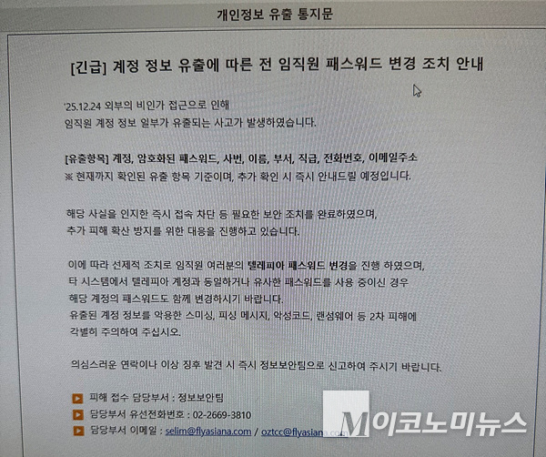 25일 항공업계에 따르면 아시아나항공은 이날 오후 2시 30분 무렵 사내에 개인정보 유출 통지문을 긴급 공지했다. 아시아나항공은 통지문에서 하루 전에 해외 서버의 비인가 접근을 통해 사내 인트라넷 텔레피아에 대한 외부의 비인가 접근(해킹)이 발생했다고 밝혔다.