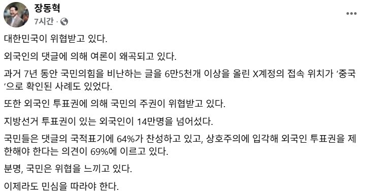 장동혁 국민의힘 대표는 이날 자신의 페이스북에 “외국인의 댓글에 의해 여론이 왜곡되고 있다”면서 “과거 7년 동안 국민의힘을 비난하는 글을 6만5천개 이상을 올린 X계정의 접속 위치가 ‘중국‘으로 확인된 사례도 있었다”고 주장했다.