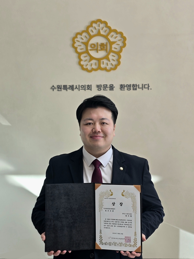 수원특례시의회 배지환 의원(국민의힘, 매탄1·2·3·4동)은 "한국매니페스토실천본부가 주관하는 「제17회 2025 지방의원 매니페스토 약속대상」에서 ‘좋은조례 분야 최우수상’을 수상했다"고 14일 밝혔다.