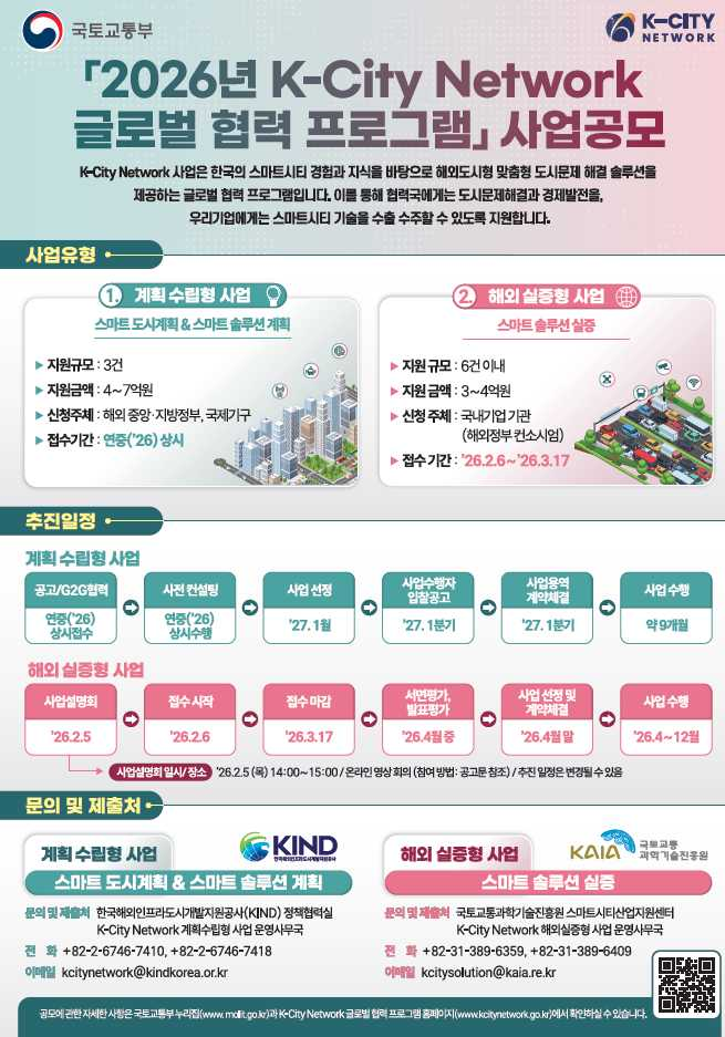 김연희 국토교통부 도시경제과장은 “K-City 네트워크 글로벌 협력사업은 해외 도시와 함께 스마트도시를 기획하고 현장에서 실증까지 이어지는 대표적인 글로벌 협력 플랫폼”이라며 “2026년에는 인공지능 기반 융합 스마트 솔루션의 해외 적용을 확대해 우리 기업의 지속가능한 해외 수출과 글로벌 경쟁력 강화를 적극 지원하겠다”고 말했다.