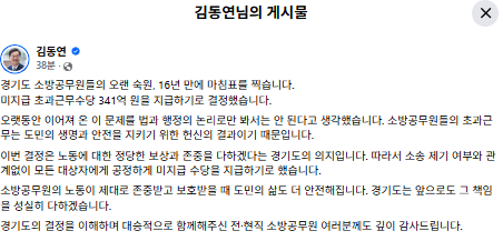 김 지사는 또 “경기도의 결정을 이해하며 대승적으로 함께해주신 전·현직 소방공무원 여러분께 깊이 감사드린다”며 감사의 뜻을 전했다.