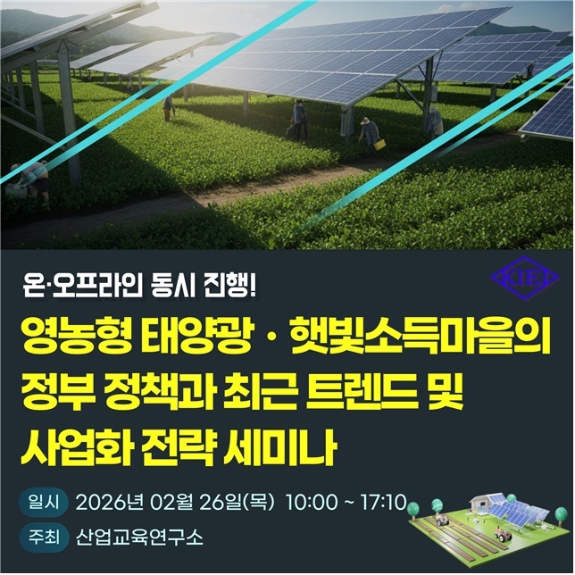 산업교육연구소(KIEI)는 오는 2월 26일 ‘영농형 태양광·햇빛소득마을의 정부 정책과 최근 트렌드 및 사업화 전략 세미나’를 온오프라인 동시 개최한다고 19일 밝혔다.