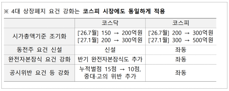 우선 올해 1월 40억원에서 150억원으로 상향된 시가총액 상장폐지 기준은 당초 2027년 200억원, 2028년 300억원으로 단계적 인상이 예정돼 있었다. 금융위는 이를 앞당겨 2026년 7월 200억원, 2027년 1월 300억원으로 조기 시행한다.
