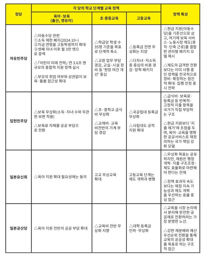 이는 세금이나 사회보험료 인상에 대한 거부감을 낮추는 효과를 노린 전략이지만, 동시에 “개혁으로 실제로 얼마의 재원을, 얼마나 빠르게 확보할 수 있는가”라는 현실적 질문을 피하기 어렵게 만든다. 유신회의 공약은 교육을 공공재로 보되, 그 운영 방식에서는 시장 논리와 효율성을 일정 부분 도입하려는 성격을 지닌다. 일본공산당은 표에서 보이듯이 가장 일관되게 교육의 공공화를 주장하는 정당이다.