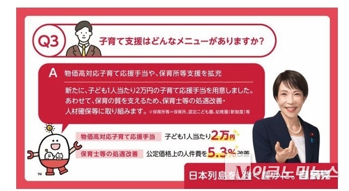 화면 중앙에는 “자녀 양육 지원에는 어떤 메뉴가 있습니까?”라는 질문이 제시되고, 그에 대한 답으로 물가 상승 대응형 육아응원 수당, 보육소 등 시설 지원 확대, 보육교사 처우 개선과 인재 확보가 명확한 숫자와 키워드로 정리돼 있다. 특히 눈에 띄는 것은 “자녀 1인당 2만 엔(한화 약 20만원)”이라는 구체적 금액을 전면에 내세운 점이다. 이는 자민당이 육아 정책을 추상적인 비전이나 장기 계획이 아니라, 당장 가계가 체감할 수 있는 현금 지원으로 설명하려는 전략을 보여준다.