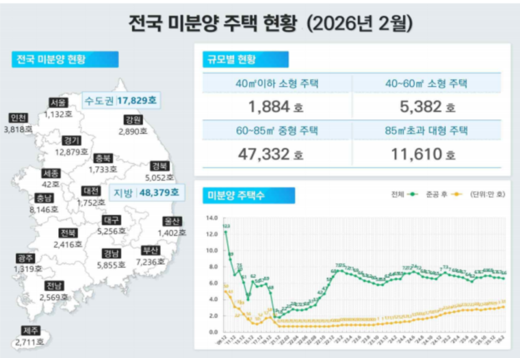 국토교통부가 31일 발표한 ‘2026년 2월 주택통계’에 따르면 2월 말 기준 전국 미분양 주택은 6만6208가구로 전월(6만6576가구)보다 0.6%(368가구) 감소했다. 반면 준공후 미분양은 3만1307가구로 전월(2만9555가구) 대비 5.9%(1752가구) 증가했다.