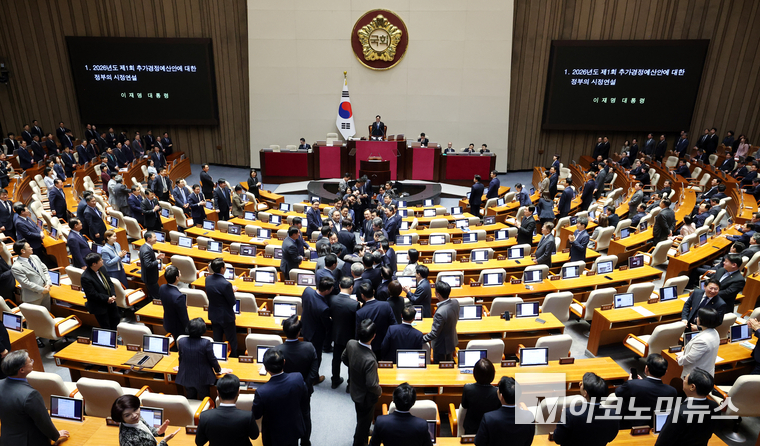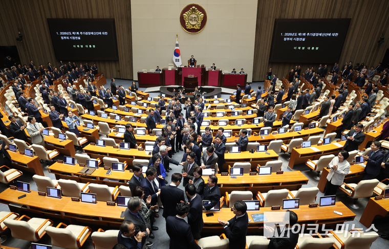 「M포토」 민주당 의원들의 환영 받으며 국회 본회의장 들어서는 이재명 대통령