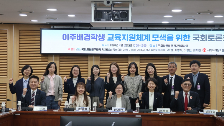 국회의원연구단체 ‘약자의눈’은 6일 국회의원회관에서 국제아동권리 NGO 세이브더칠드런과 공동으로 ‘이주배경학생 교육지원체계 모색을 위한 국회토론회’를 개최했다. 이번 토론회에서는 강득구 의원 겸 약자의눈 대표와 연구단체 소속인 김예지·강경숙(연구책임의원)을 비롯해 김현·서영석·이정헌·최혁진 의원이 뜻을 모아 우리 사회 교육 구조의 개선을 촉구했다.