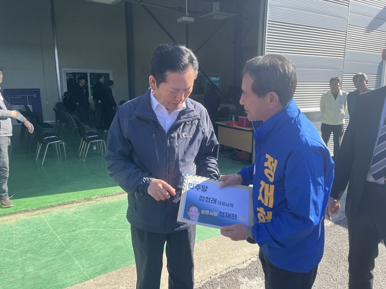 이날 현장에서 정재현 민주당 상주시장 후보는 정청래 대표에게 상주지역의 핵심 현안을 직접 전달하며 당 차원의 적극적인 지원을 요청했다.