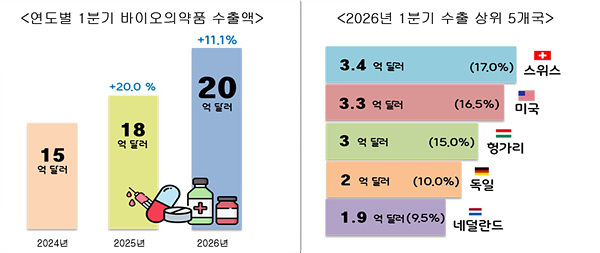 국내 바이오의약품 2026년 1분기 수출 규모가 지난해 1분기 수출액보다 11.1% 증가한 20억 달러(한화 약 2조9688억원, 잠정)로 최대 기록을 달성하며 글로벌 시장에서의 위상을 높였다. 이는 글로벌 시장에서 K-바이오의약품 점유율 증가와 바이오의약품 위탁개발생산(CDMO) 경쟁력 확대가 주요한 요인으로 파악된다.