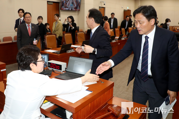 「M포토」 한국은행 총재 후보자 청문보고서 채택 후 인사하는 여야