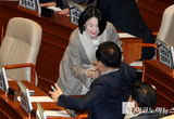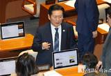 「M포토」 본회의서 의원들과 인사하는 김병기