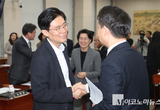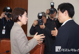 「M포토」 추경안 의결 뒤 악수하는 김영호-조정훈