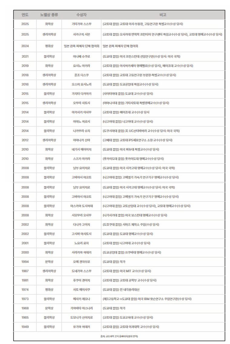이들 중 다수는 교토대학 졸업생이거나 교수로 재직했던 연구자들로 일본 과학기술 발전을 이끌어 온 핵심 인물들이다. 교토대는 “자유로운 발상과 독창적 탐구”를 기치로 내걸고 있으며, 이 같은 연구 문화가 장기간의 축적된 결과가 세계적 성과로 이어졌다고 강조한다. 이번 두 명의 수상은 교토대학은 기초과학 전통이 여전히 살아 있음을 보여주는 상징적인 사건으로 평가된다.