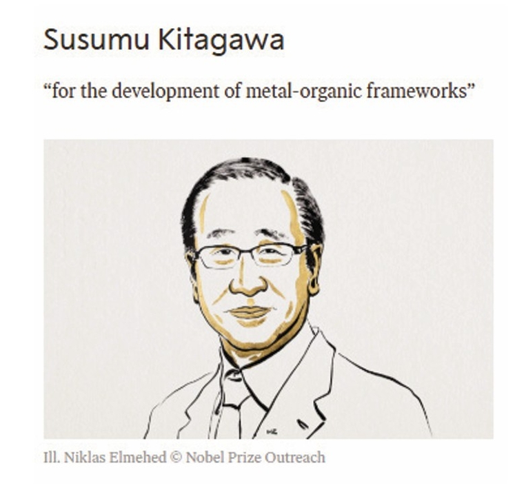 기타가와 교수는 금속 이온과 유기물이 결합해 자연스럽게 격자 구조를 이루는 금속–유기 골격체(MOF, Metal–Organic Framework)를 발견했다. 이는 고열이나 고압, 촉매를 사용하지 않고 분자 간의 미세한 인력을 통해 자발적으로 결합하는 혁신적 신소재다(일본 산케이 신문, 2025.10.15.).