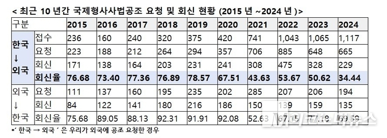 지난해 보이스피싱 등 국제범죄와 관련해 외국에 요청한 국제형사사법공조 회신율이 2015년 이래 근 10년간 최저치를 기록한 것으로 확인됐다.