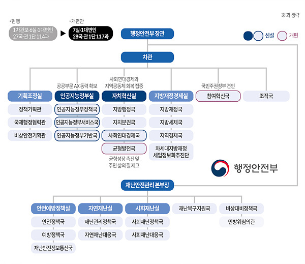 행정안전부는 5일 부처 조직개편안을 발표했다. 윤호중 행정안전부 장관은 “AI정부실을 설치해 공공부문 AX 동력을 확보하겠다”는 말과 함께 부처 조직개편안을 직접 소개했다. 새로운 조직개편안은 공공부문의 인공지능 전환(AX)을 총괄할 조직으로 인공지능(AI)정부실을 신설하는 것을 포함해 7실·1대변인·28국·관으로 구성된다.