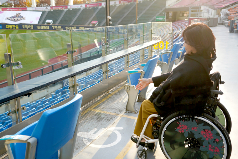 이날 서울 잠실종합운동장에서 진행된 점검에서는 전문가들과 함께 △장애인석까지의 접근 경로 용이성 △피난통로 연계성 △동선 및 단차 여부 △유효 바닥면적 (폭 90cm·깊이 130cm) 충족 여부 △시야를 방해하는 구조물 존재 여부 등을 중심으로 정밀 점검이 이루어졌다.