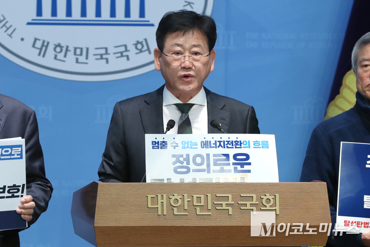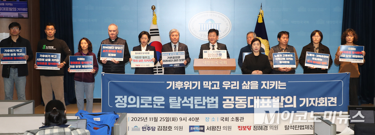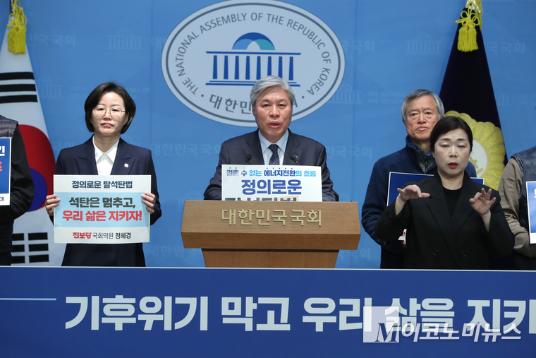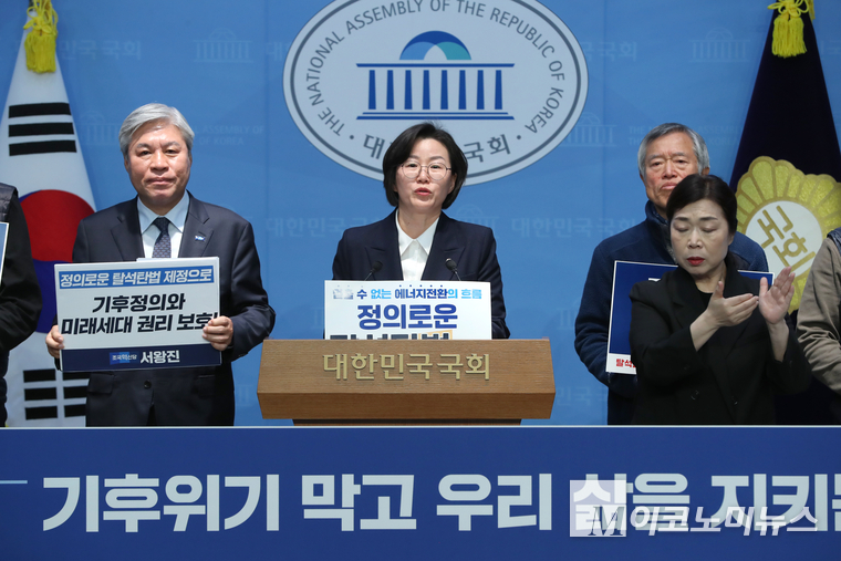김정호 더불어민주당 의원과 서왕진 조국혁신당 원내대표, 정혜경 진보당 의원과 탈석탄법제정을위한시민사회연대 등은 25일 국회 소통관에서 탈석탄법 공동대표발의 기자회견을 열었다.