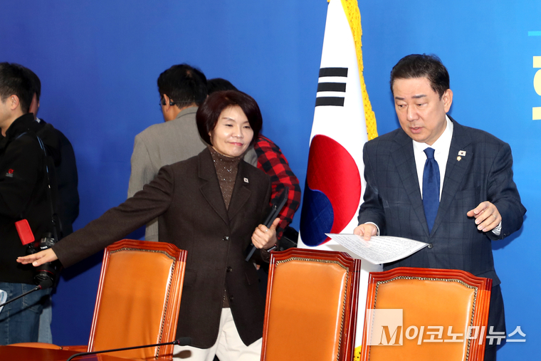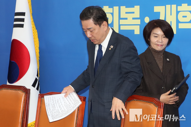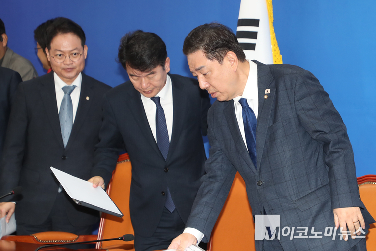 「M포토」 원내대책회의에서 참석하는 김병기 원내대표와 원내지도부