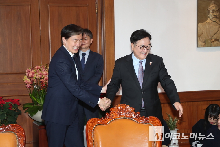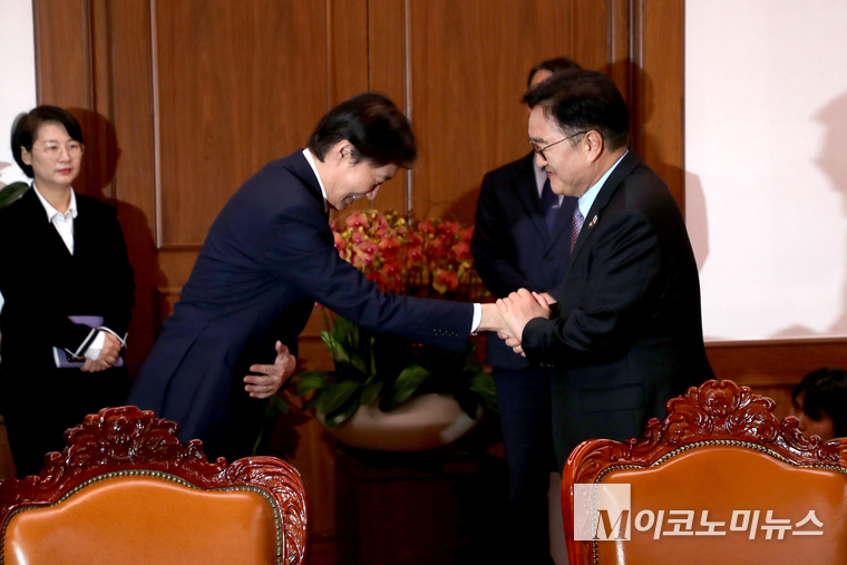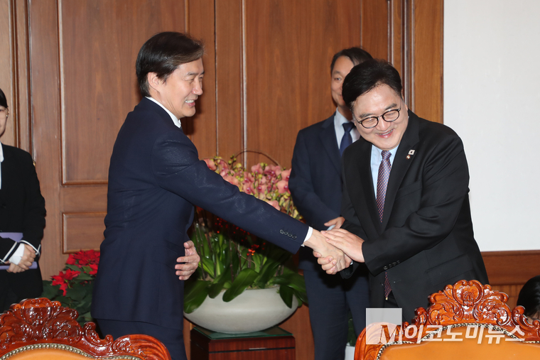 「M포토」 우원식 국회의장과 악수하는 조국 대표
