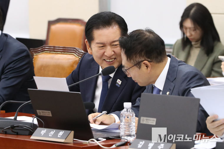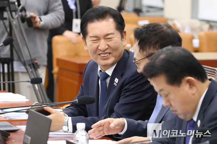 「M포토」 국방위 전체회의에서 환하게 웃는 정청래 민주당 대표