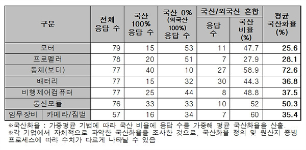 상용 드론의 부품별 국산화율을 살펴보면, 모터·프로펠러·동체(보디)·배터리·비행제어컴퓨터·통신모듈 등 주요 부품 중 국산화율이 제각각이다. 항공안전기술원에서 분석한 자료(2024년 드론산업 실태조사 보고서)에 따르면, 보디의 국산화율은 평균 72.6%, 모터는 25.6%에 그치는 것으로 나타났다. 국방부는 핵심 부품의 국산화율을 단계적으로 높인다는 계획이다.