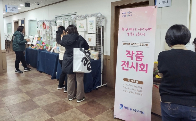 수원시 영통구 매탄3동 주민자치회(회장 정희경)는 "지난 2일부터 매탄3동 행정복지센터 3층에서 주민자치프로그램 작품전시회를 추진해 나가고 있다"고 3일 밝혔다.