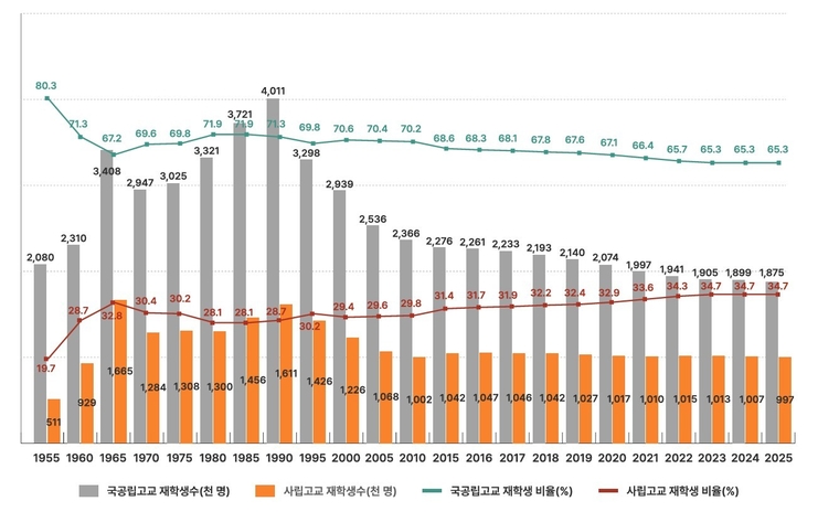 고교 무상교육이 실시된 2010년 이후 설립별 고교 재학생 추이를 살펴보면 국공립 고교 재학생은 같은 기간 236만6000명에서 187만5000명으로 크게 감소한 반면, 사립고교 재학생은 같은 기간 100만2000명에서 99만7000명으로 큰 변화가 없다. 특이한 점은 전체 재학생 중 사립고교에 재학하는 학생 비율이 2010년 29.8%에서 2025년 34.7%로 5%가량 증가하였다 는 것이다.