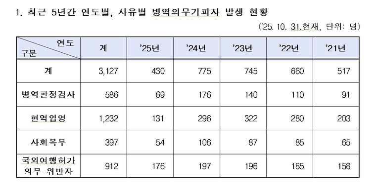 기피 유형별로는 △현역입영 기피가 1,232명(39.4%)으로 가장 많았고 △국외여행허가 의무 위반 912명(29.2%), △병역판정검사 기피 586명(18.7%) △사회복무 소집 기피 397명(12.7%) 순이었다.