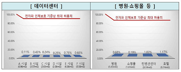 같은 기준으로 병원은 5.63mG(0.68%), 쇼핑몰은 1.61mG(0.19%), 컨벤션센터는 8.59mG(1.03%), 호텔은 9.74mG(1.17%)로 나타나 데이터센터가 상대적으로 낮은 수치를 기록했다.