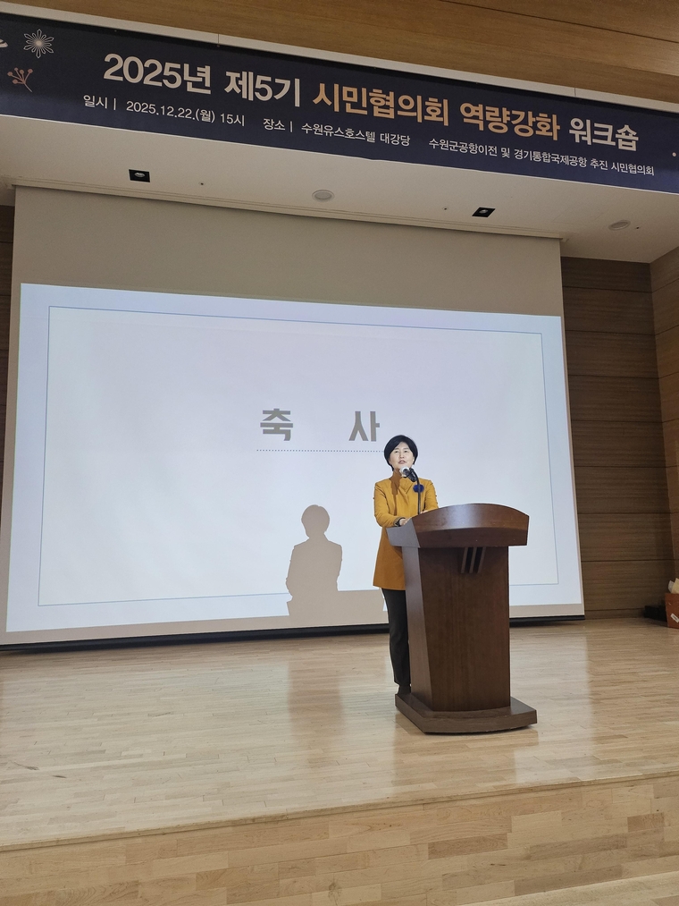 이번 워크숍은 ▲유공 시민 포상 및 신규 임원 위촉 ▲전문가 강연 ▲2025년 활동 성과 및 2026년 사업계획 보고 ▲활동 방향 분과별 토론 ▲수원 군공항 이전 결의 퍼포먼스 순으로 진행됐다.