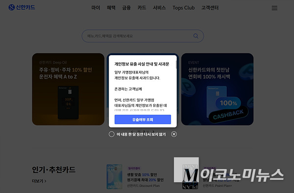 한편 현재 신한카드 홈페이지에는 개인정보 유출여부를 조회할 수 있는 페이지도 마련돼 확인할 수 있다.