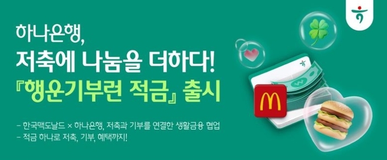 ‘행운기부런 적금’은 하나은행과 한국맥도날드가 협업해 선보인 상품으로, 만기 시 고객이 선택한 일정 금액이 기부로 연계되는 것이 특징이다. 기부금은 장기 치료가 필요한 환아와 가족을 지원하는 비영리 단체인 한국로날드맥도날드하우스(RMHC)에 전달된다.