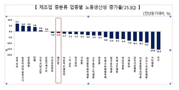 생산성본부는 제조업의 생산성 감소가 노동 투입 증가에도 불구하고 공정 운영 효율과 기술 활용을 통한 부가가치 창출이 뒤따르지 못한 구조적 문제라고 진단했다.