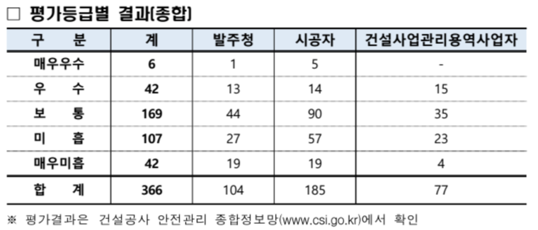 박동주 국토부 건설안전과장은 “안전관리를 소홀히 하는 주체에게는 명확한 책임을 묻고, 안전관리에 힘쓰는 주체에게는 합당한 보상을 부여하기 위해 안전관리 수준평가의 평가대상과 결과 활용을 지속 확대해 나갈 계획”이라고 밝혔다.