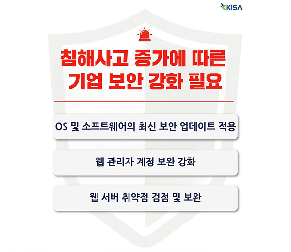 KISA는 보안 강화를 위해 △운영체계(OS) 및 소프트웨어의 최신 보안 갱신(업데이트) 적용 △웹 관리자 계정 보안 강화 △웹 서버 보안 취약점 점검 및 보완 등을 권고했다.