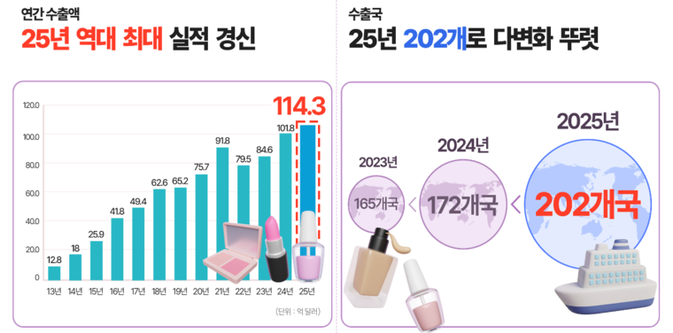 식품의약품안전처는 2025년 한 해 우리나라 화장품 수출 규모가 전년 대비 12.3% 증가한 114억 달러를 기록하며 역대 최대 실적을 경신했다고 밝혔다. 이는 2024년 101억8000만 달러에서 증가한 수치로, 2023년 이후 3년 연속 성장세다.