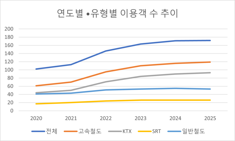 고속철도 가운데 KTX 이용객은 9300만 명, SRT는 2600만 명으로 집계됐다. 일 평균 이용객은 KTX가 25만4000명, SRT가 7만1000명 수준이다. 이용률은 KTX 110.5%, SRT 131.0%였으며, 승차율은 각각 66.3%, 78.1%로 나타났다.