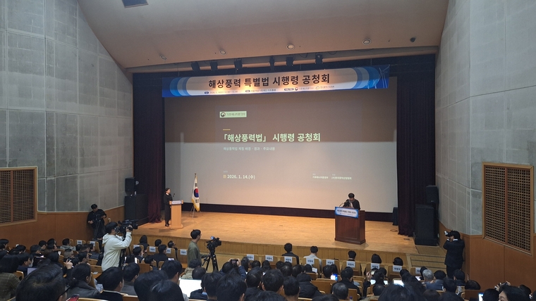 올해 3월 26일 입법예고를 앞둔 해상풍력특별법 하위법령(시행령·시행규칙)의 제정 배경과 주요 내용을 설명하고 핵심 쟁점에 대한 업계 의견을 수렴하기 위한 공청회가 서울 여성가족재단아트홀봄에서 14일 열렸다. 이날 공청회에는 해상풍력 업계 관계자 300여 명이 참석했다.