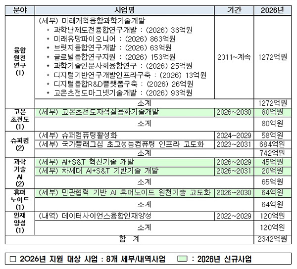 2026년도 융합원천기술개발사업 시행계획은 융합 원천 연구, 고온초전도, 슈퍼컴퓨터, 과학 기술 인공지능, 인간형 로봇(휴머노이드) 분야를 대상으로 하며, 이 가운데 4개 신규사업이 209억원 예산으로 추진된다. 4개 신규사업은 △고온초전도 자석 실용화 기술개발(80억원) △인공지능+과학기술 혁신 기술개발(45억원) △차세대 인공지능+과학 기술 기반 기술개발(20억원) △민·관 협력 기반 인공지능 인간형 로봇(휴머노이드) 원천기술 고도화(64억원) 등이다.